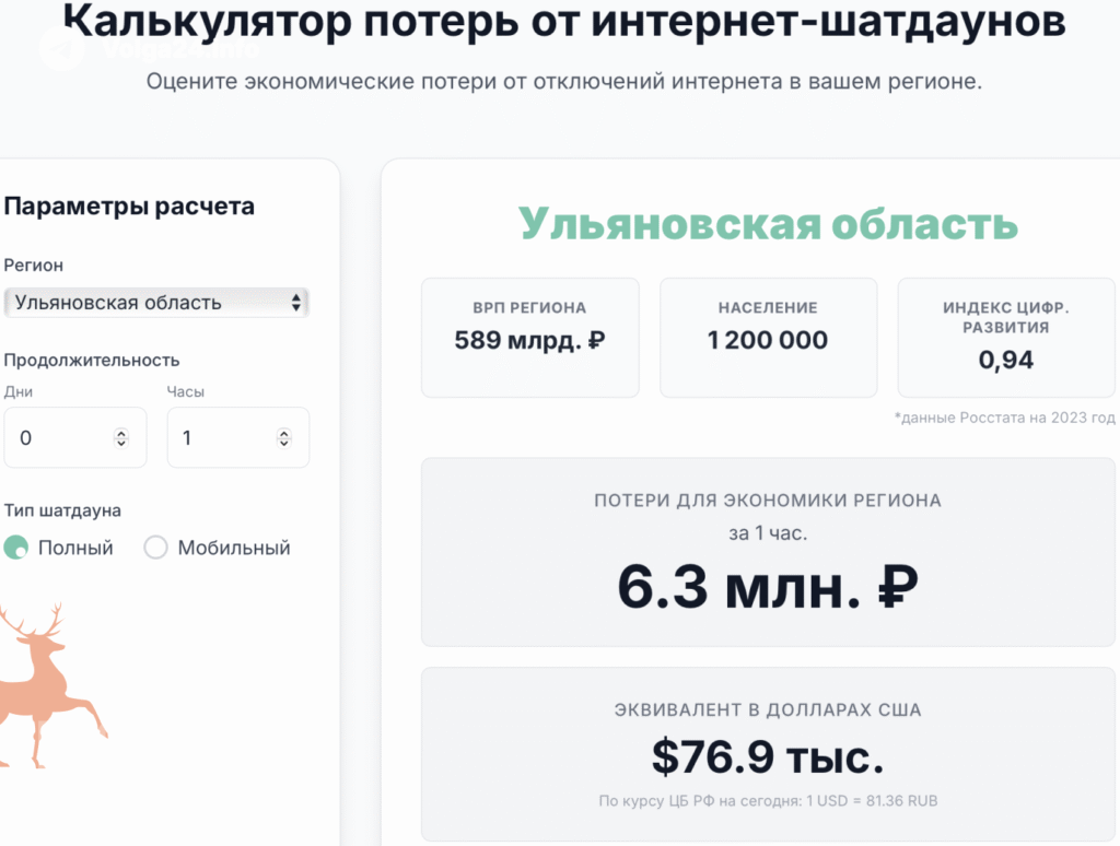 Калькулятор потерь от интернет-шатдаунов рассчитал, что экономике Ульяновской области обходится в 3,1 млн рублей один час без мобильного интернета. Если речь идёт о полном отключении сети, то час обойдётся в 6,3 млн рублей.