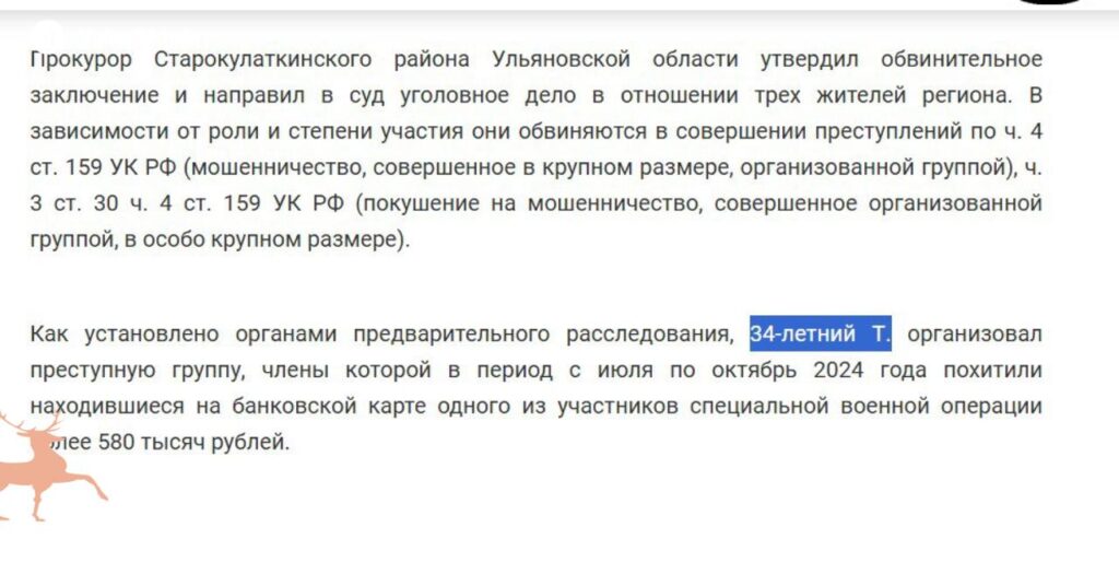 В Ульяновской области депутат «Единой России» и глава «Молодой гвардии» Газинур Тимушев, координатор фонда «Защитники Отечества» Ильдар Курмакаев и Алсу Абдуллина обвиняются в мошенничестве в особо крупном размере. В июне-июле 2024 года они уговорили знакомого подписать контракт с Минобороны и похитили 580 тыс. рублей с его банковской карты.